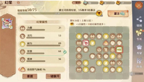 在角色链接界面属性设置中,玩家可自主设定幻果的主属性加成方向。需特别注意的是主属性将实现100%转化效能,而其他副属性仅保留20%转化率。建议根据职业特性精准匹配:盾卫优先耐力强化、魔导侧重智慧提升、铳士专注灵巧发展、猎影着重力量突破、灵医主攻精神成长,确保属性收益最大化。