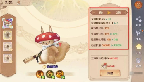 当五维属性达到升星标准后,需收集对应数量的幻果碎片进行星级突破。每次升星将全面提升基础属性数值,并同步强化专属技能等级。建议提前规划碎片获取路径,通过日常副本和限时活动稳定积累升星材料。