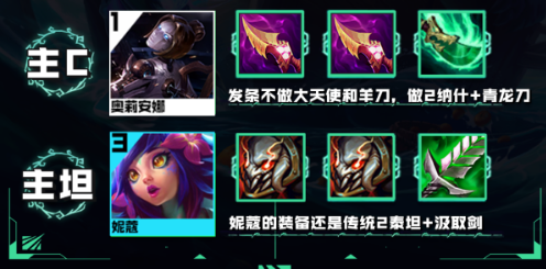 1、核心成员配置:奥莉安娜、米利欧、索拉卡、塔里克、妮蔻、慎、虚空行者/沙漠死神、符文法师