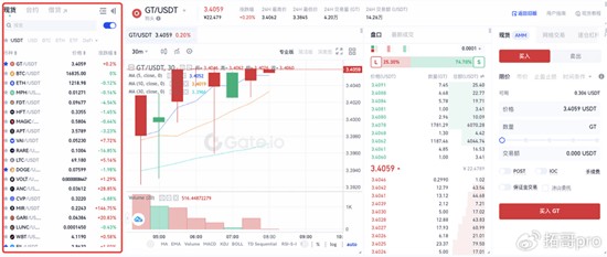 2、进入交易界面后,左侧市场列表展示所有可交易品种,以GT/USDT交易对为例,选定后系统将自动加载对应交易图表与订单簿信息。