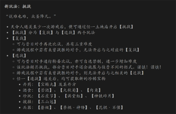通关主线剧情后即可解锁土地庙的挑战功能,该系统包含两大模式:复战模式允许玩家重新体验经典战役,设置普通/困难/噩梦三级难度梯度,需注意未曾在主线击败的BOSS将无法解锁对应复战;连战模式则提供连续作战体验,玩家可通过附加限制条件提升挑战难度,部分BOSS将展现全新战斗机制,成功通关可获得限定装备奖励。