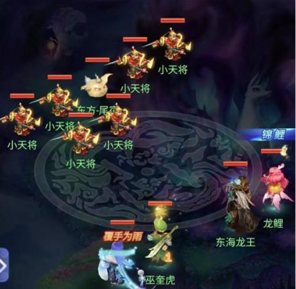 布雨神君与红龙构建双控体系,龙鲤的高速突袭配合巫奎虎的爆发输出,可快速瓦解敌方防线。此阵容需注意站位调整以确保连携技触发效率。